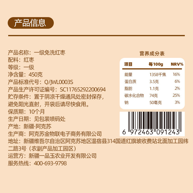 一品玉 一级免洗红枣 蜜饯果干肉厚香甜即食红枣 450g - 一品玉旗舰店