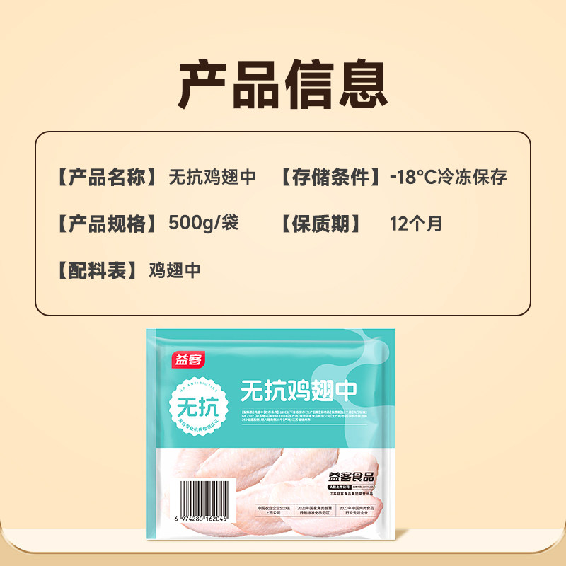 益客无抗鸡翅中500g2袋新鲜冷冻鸡中翅奥尔良烤翅空气炸锅 - 益客食品旗舰店