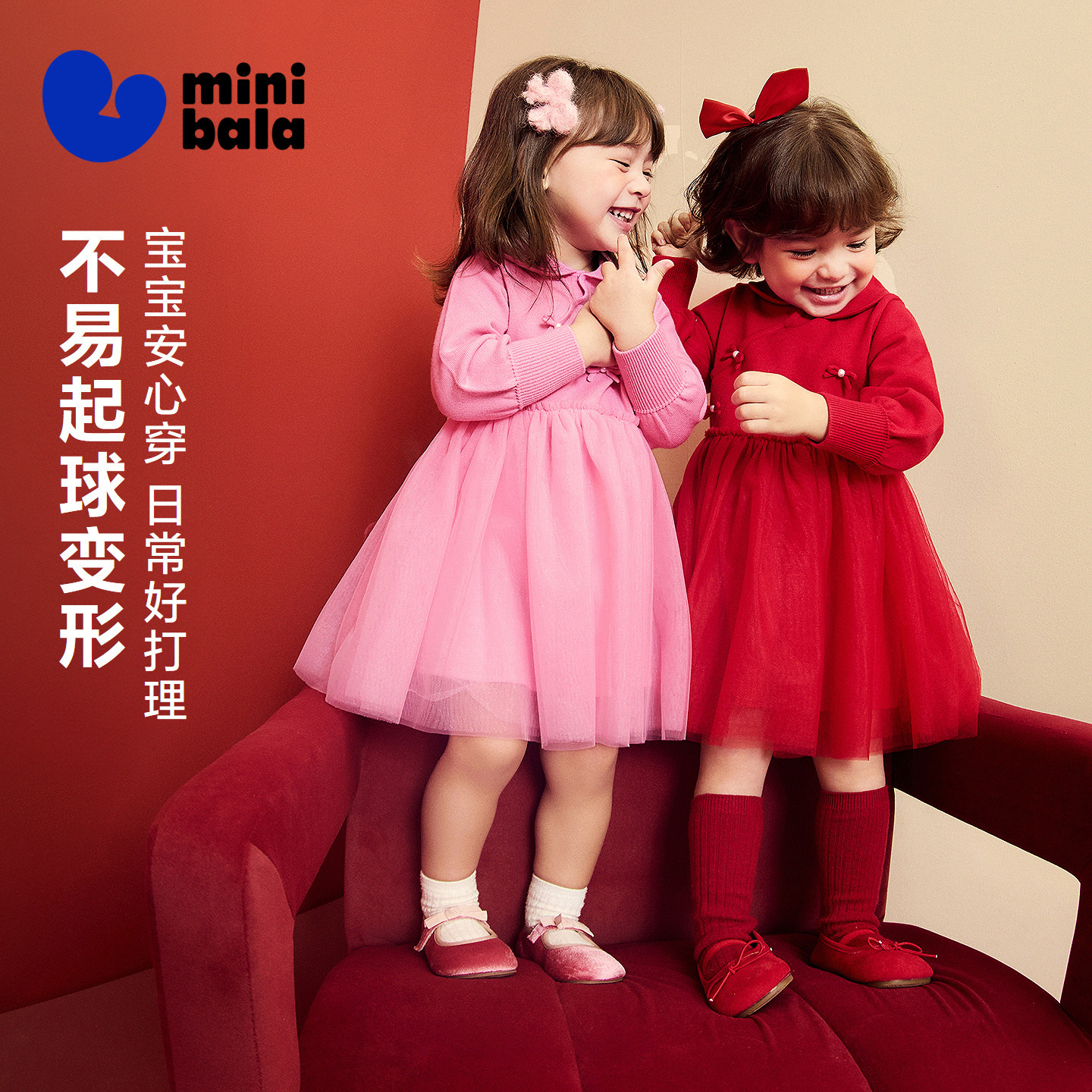 迷你巴拉女童宝宝连衣裙不易起球针织网纱甜美新年拜年红色裙子冬 - minibala官方旗舰店