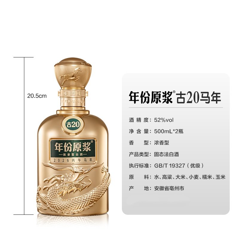 您的位置:优特荟  >   >  【新品】古井贡酒年份原浆52度古20马年生肖酒500ml*2双瓶礼盒装