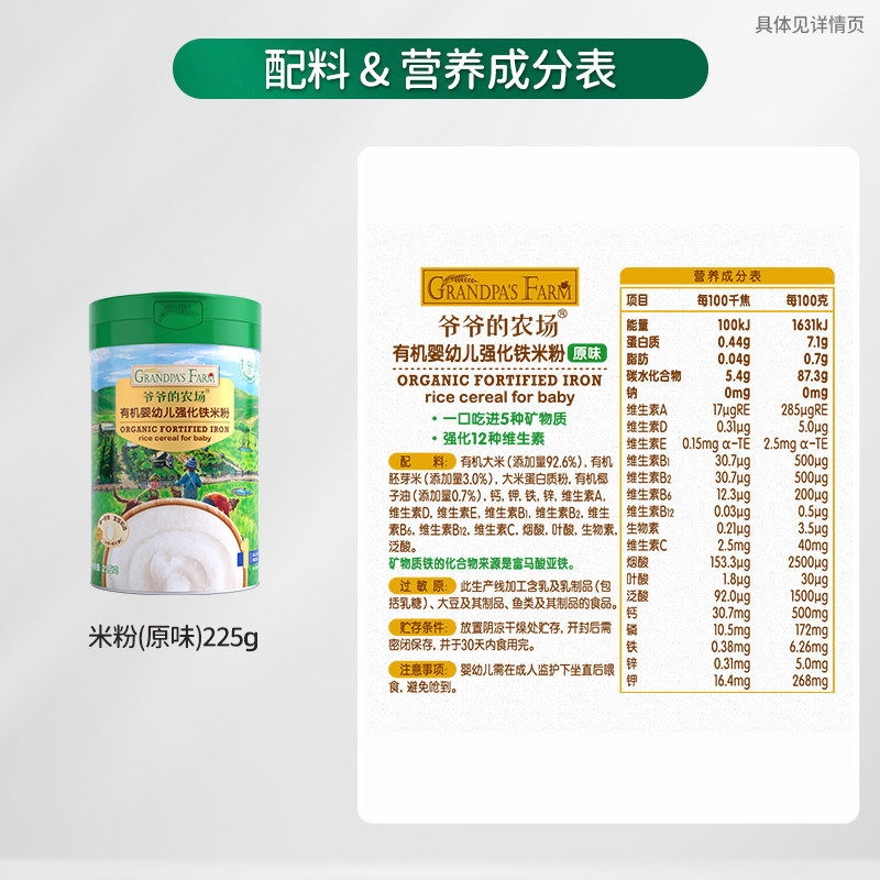 爷爷的农场宝宝辅食高铁有机米粉宝宝辅食米糊婴儿维C加铁原味6月 - 天猫超市