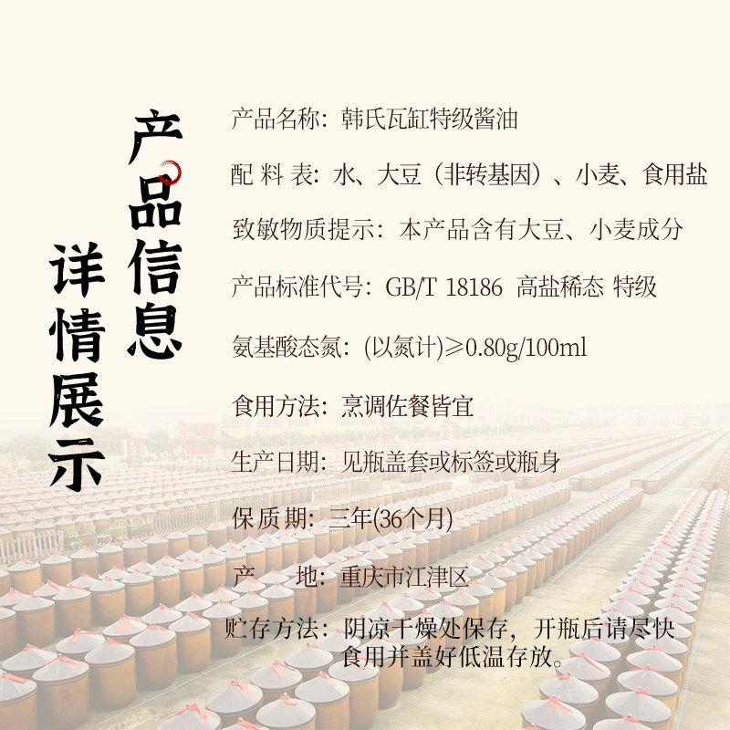 韩氏瓦缸500ml特级酱油纯粮古法手工酱油非遗传承技艺 - 韩氏瓦缸食品专营店