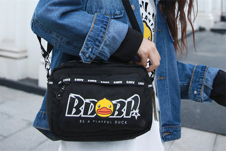 原创的小黄鸭图案和潮酷字母织带相呼应,街头风满满。多层隔袋将包包里整理的干净整洁,出门装起东西来更是得心应手。材质上,尼龙材质不仅轻便,而且防泼水、耐脏,特别结实耐用。细节处很精致,金属拉牌上也有品牌图案,肩带可卸可调节,超方便。