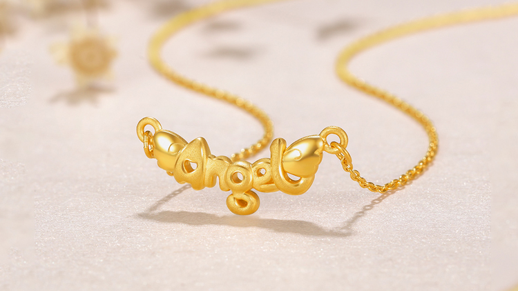 这一款项链采用了足金的材质,自带奢华的贵气感,“angel”的字母主体生出了一双别致可爱的小翅膀,圆润线条萌态十足,独特的造型提升了品味,再加上其边缘的细微勾勒,展现出一种时尚的造型感。