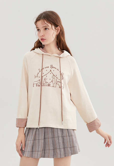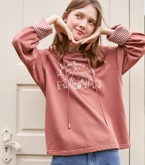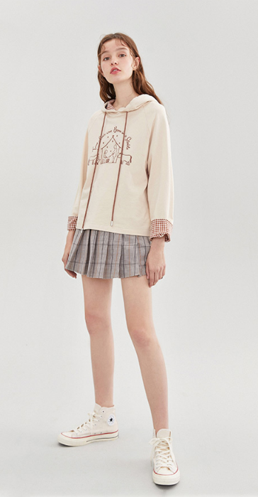 胸前的印花设计元素,起到了点缀的作用,展现出俏皮活泼的少女感。衣袖处的格子拼接设计风格,给整体增添了别致新颖的设计灵感。