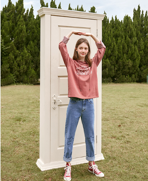 宽松高腰直筒牛仔裤,和卫衣相搭配,展现出了休闲随性的时尚个性。宽松直筒的裤型剪裁设计,恰到好处的遮掩了腿部赘肉,是腿粗女孩的福音。