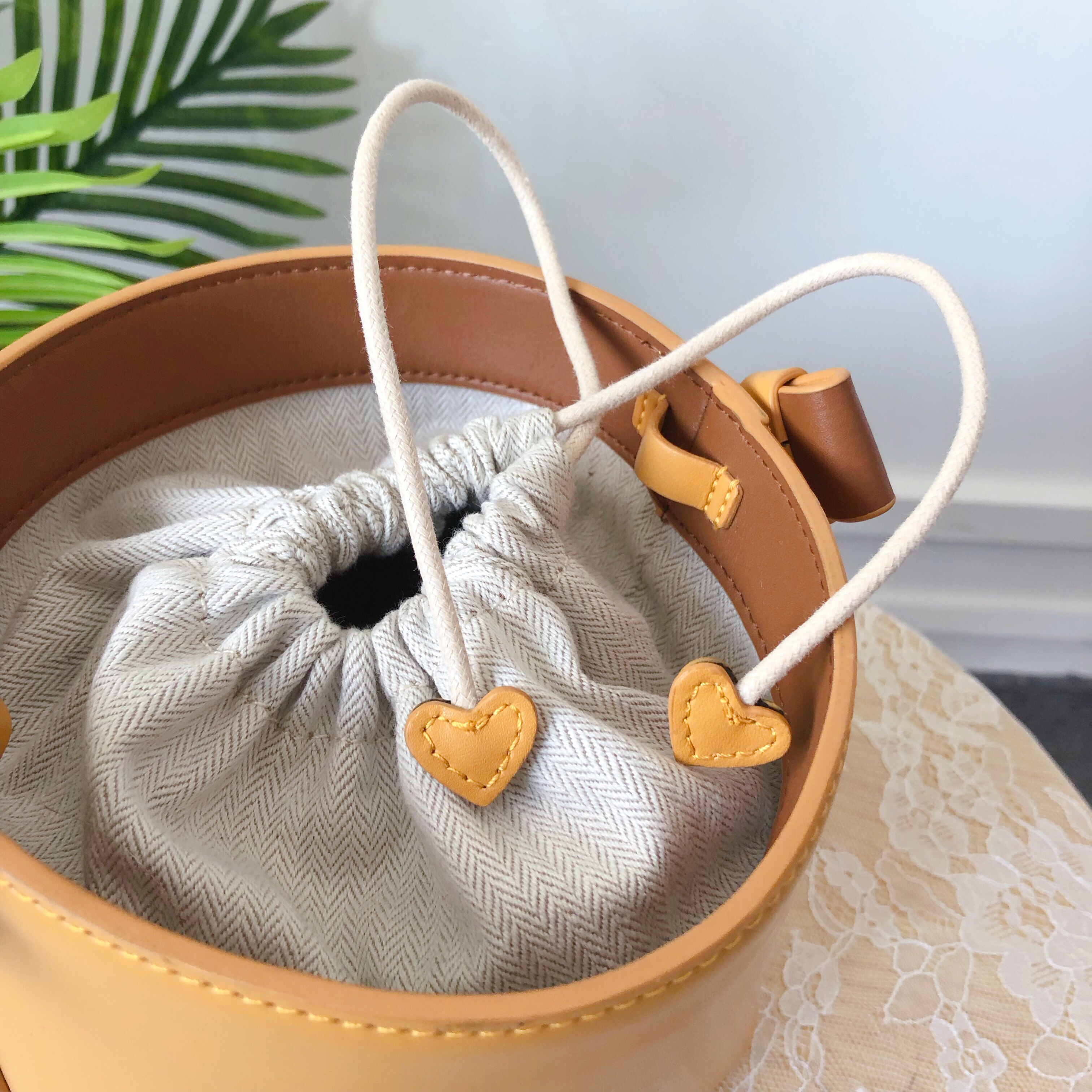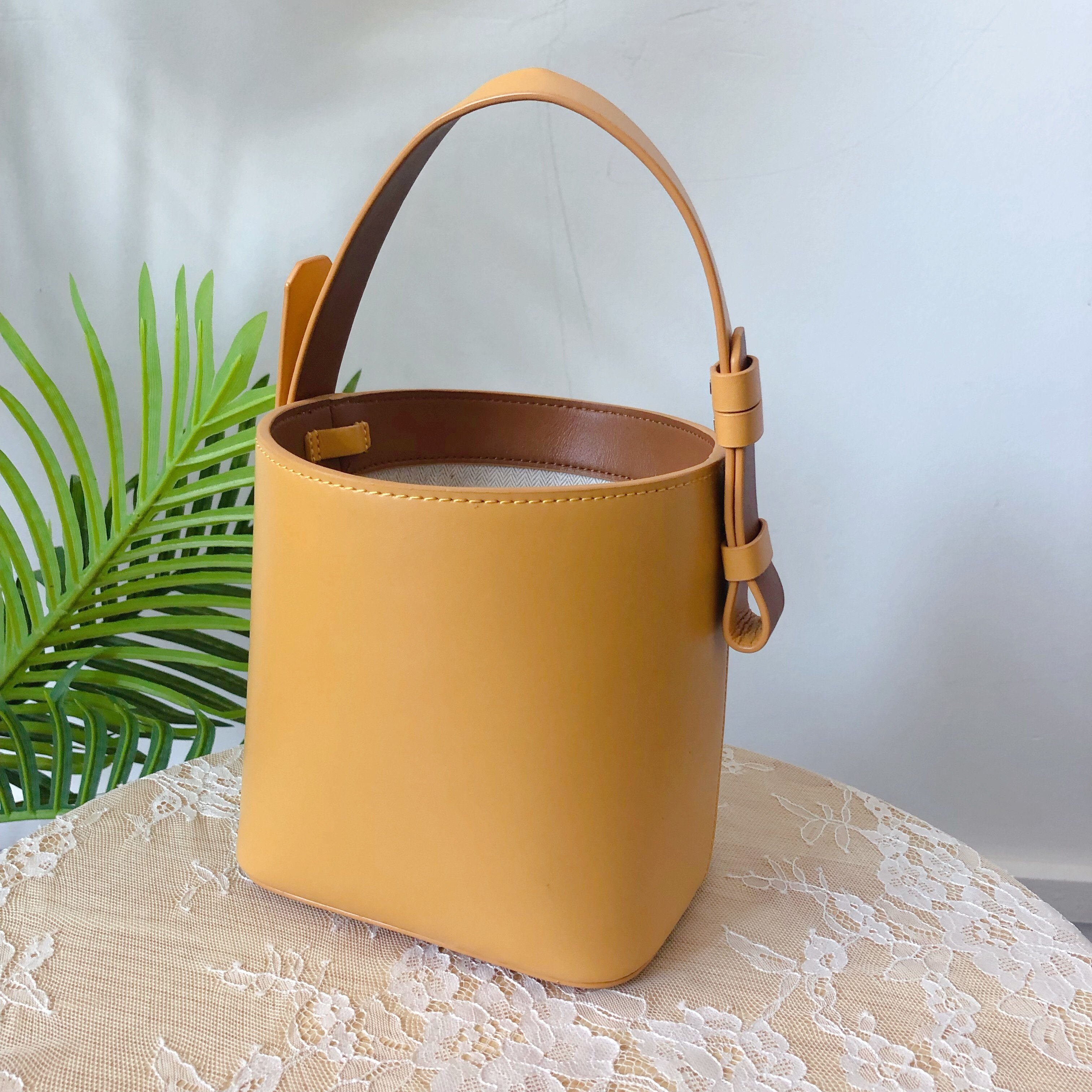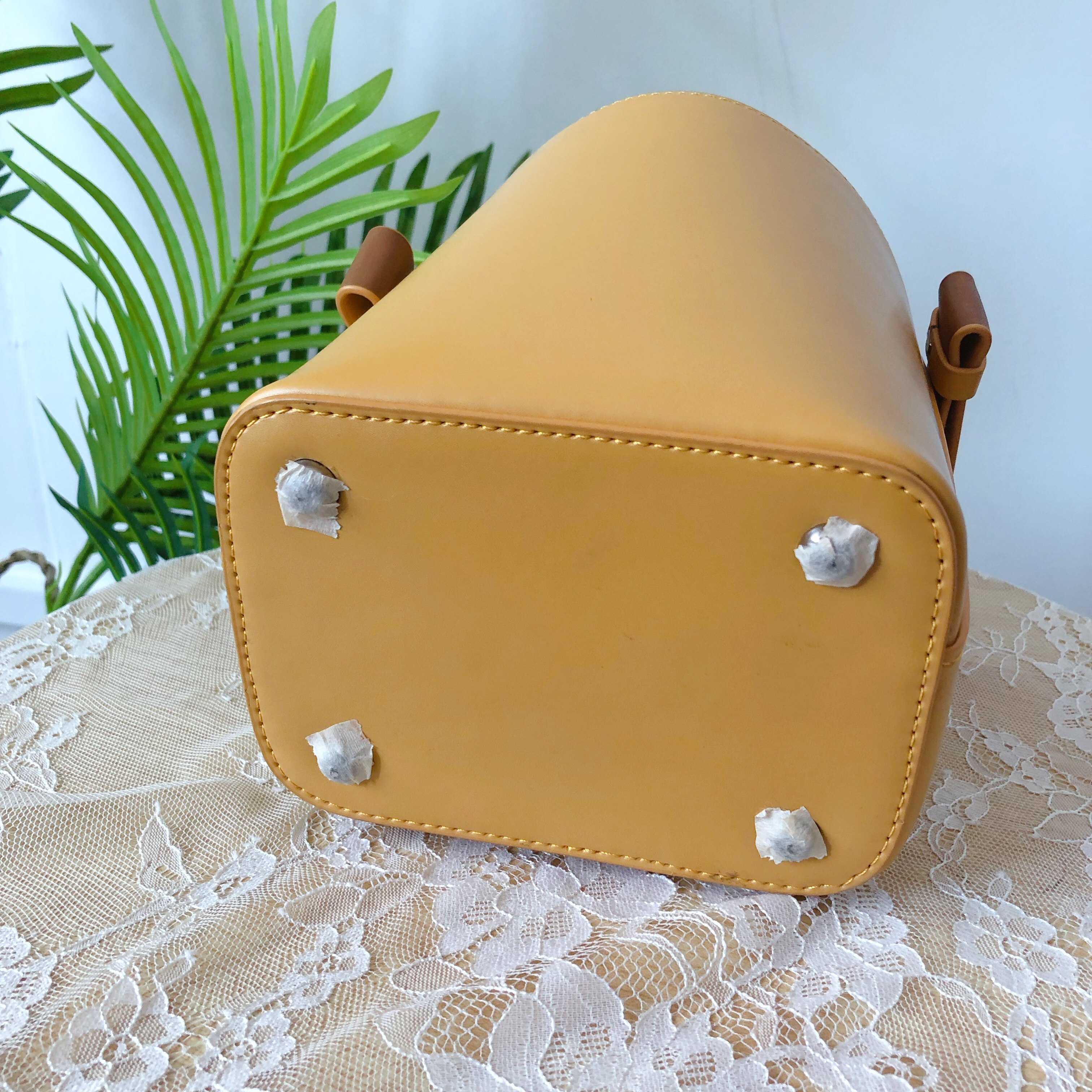 水桶造型让这个包包独特别致,可手提也适合斜挎,实用性强,满足不同衣着的穿搭需求,内里是帆布抽绳包包设计,层次显不同,底部的金属站钉防止包包被磨损。