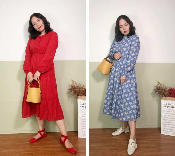 金秋季节一到,又是结婚季的来临。红色的连衣裙+红色的绑带单鞋是喜庆的新娘装穿搭,选择这个黄色的水桶包包衬托,让你的整体穿搭不会显得过于成熟,虽然进入了人生的另一个阶段,但少女心还有要保持着的。