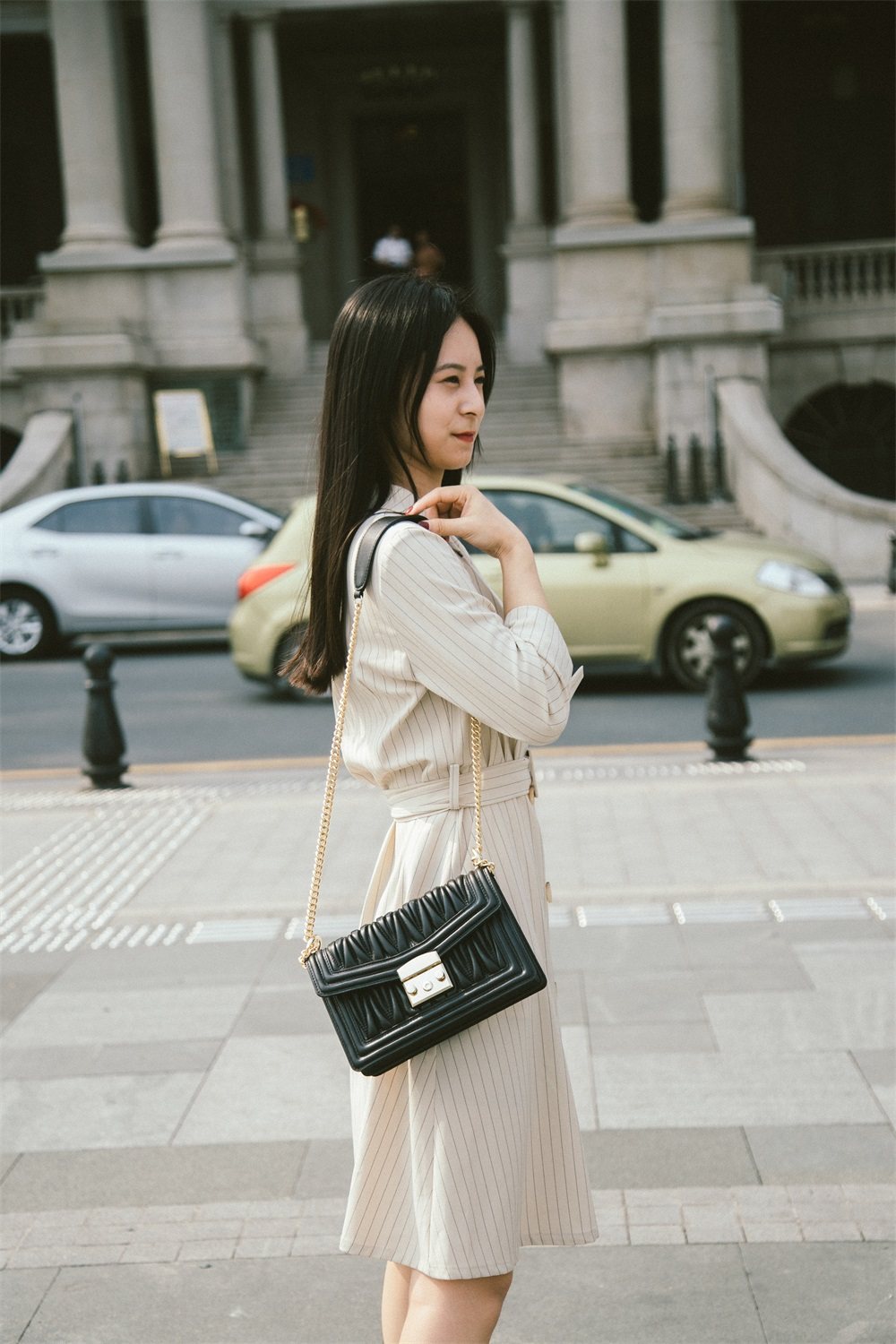 所以对于不同颜色的衣服和包包,我们只要把握好衣服和包包风格上的和谐就好。比如百搭的链条小方包可以搭配轻熟风连衣裙、衬衫等。