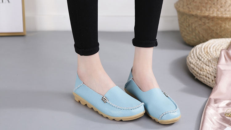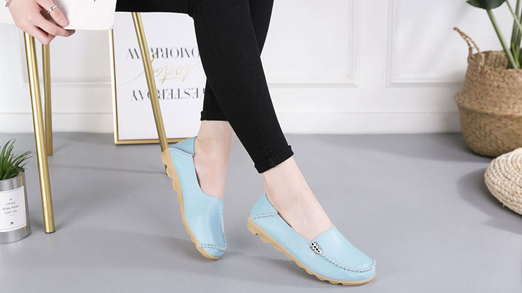 这是一款很时尚的豆豆鞋,经典的圆形鞋头,淡蓝色凸显出淑女气质,精致的金属扣装饰,整双鞋子都是非常精致的,浅口的穿脱非常的方便呢!