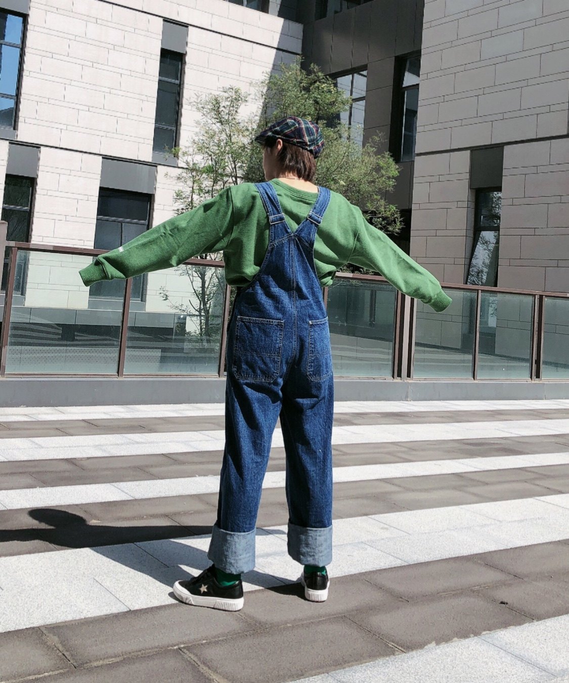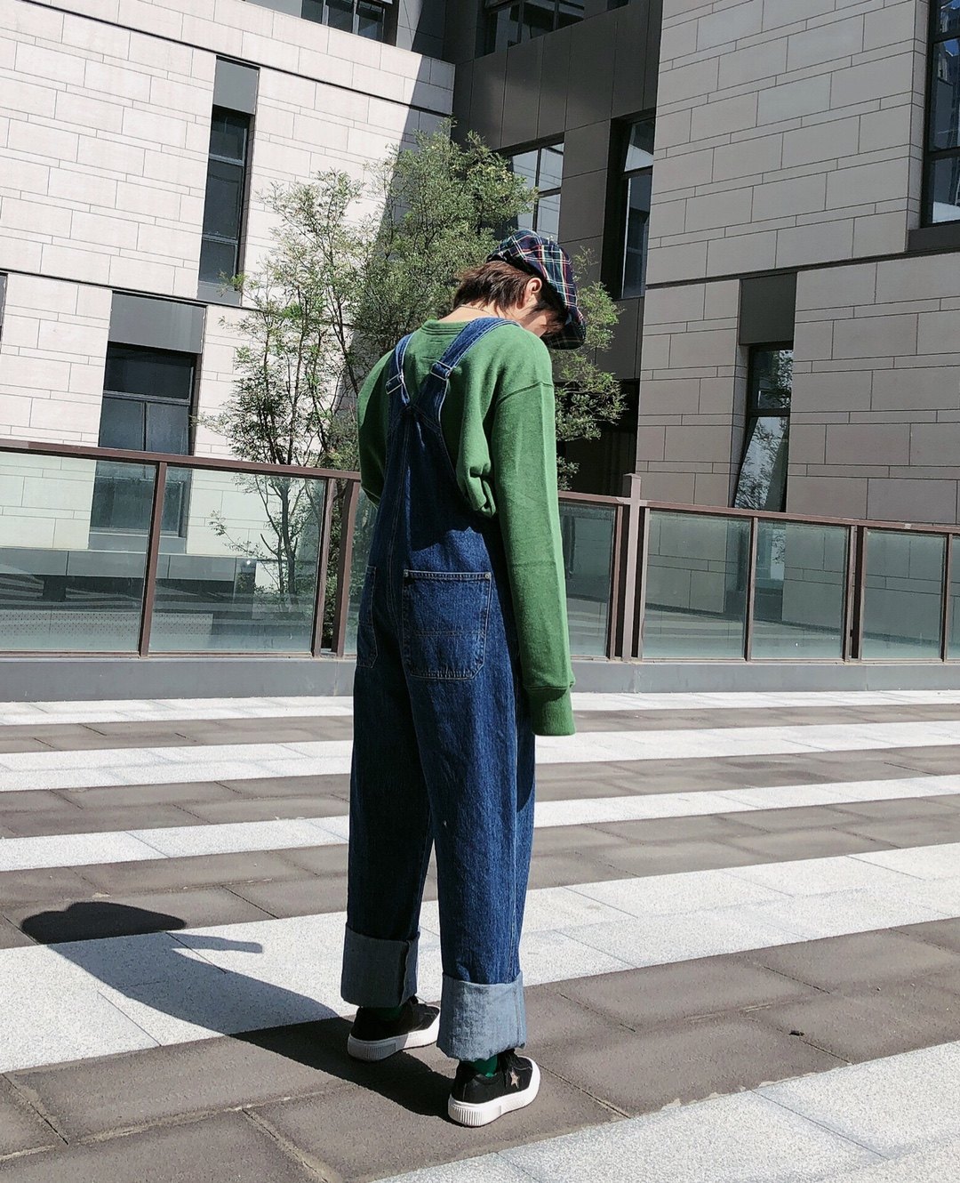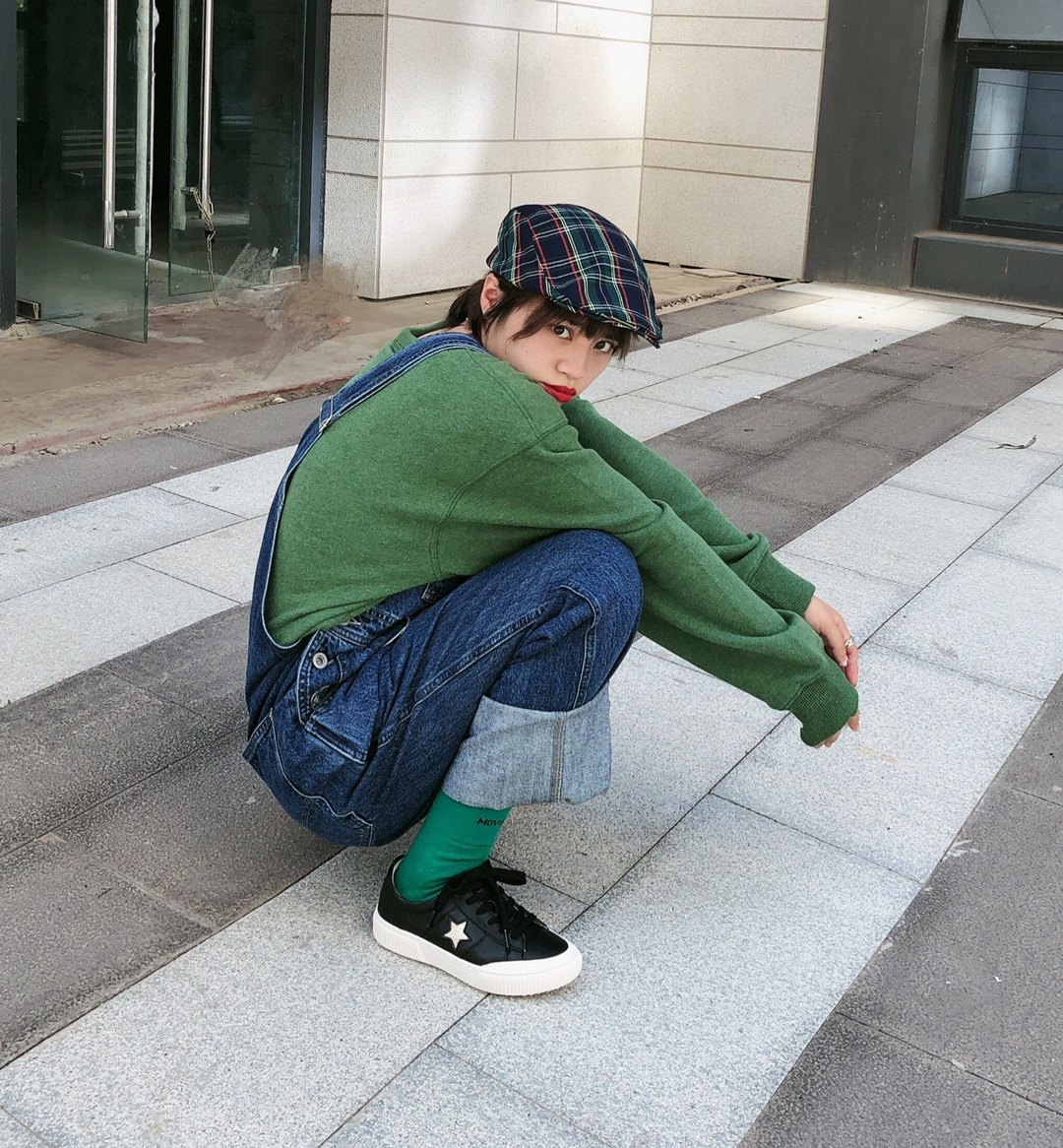 不服输的头号时髦精来个减龄的穿搭,绿色卫衣和牛仔蓝背带裤撞色,鞋子选择低调的黑色稍加过度,整体饱和度高符合俏皮减龄的颜色基调。