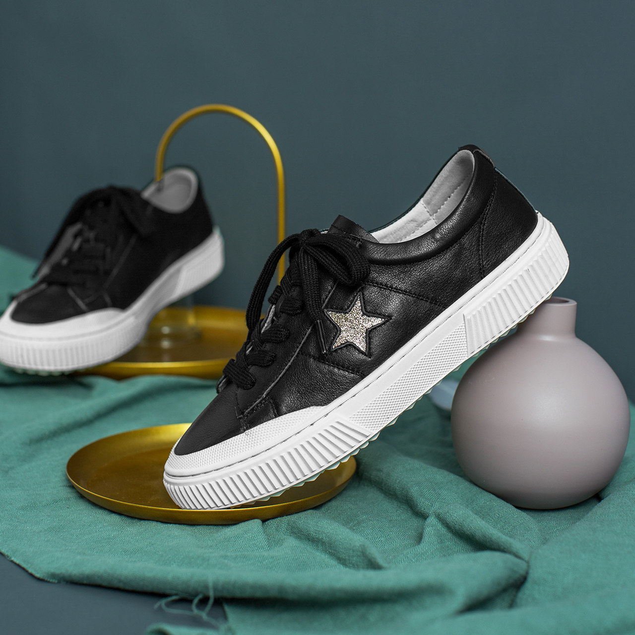 越是简单的单品越不怕撞款,所以小白鞋一年四季人人都爱穿。越是简单的单品越不怕撞款,所以小白鞋一年四季人人都爱穿,低调百搭的颜色深受时髦精们的喜爱,白净让人可自由发挥的空间无穷大。而黑色款,大概就是为那些懒癌患者准备的,喜欢简单的小白鞋样式却嫌清洁麻烦。 每个季度都要来几双的简单款小白鞋,已经足够简单了,在鞋底加了弹力豆豆,走起路来更有弹性了。 帮面采用柔软的纳帕头层牛皮装饰五角星,一如既往的简单风格。不服输的头号时髦精来个减龄的穿搭,绿色卫衣和牛仔蓝背带裤撞色,鞋子选择低调的黑色稍加过度,整体饱和度高符合
