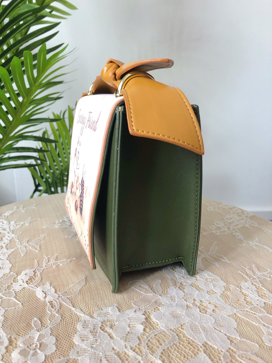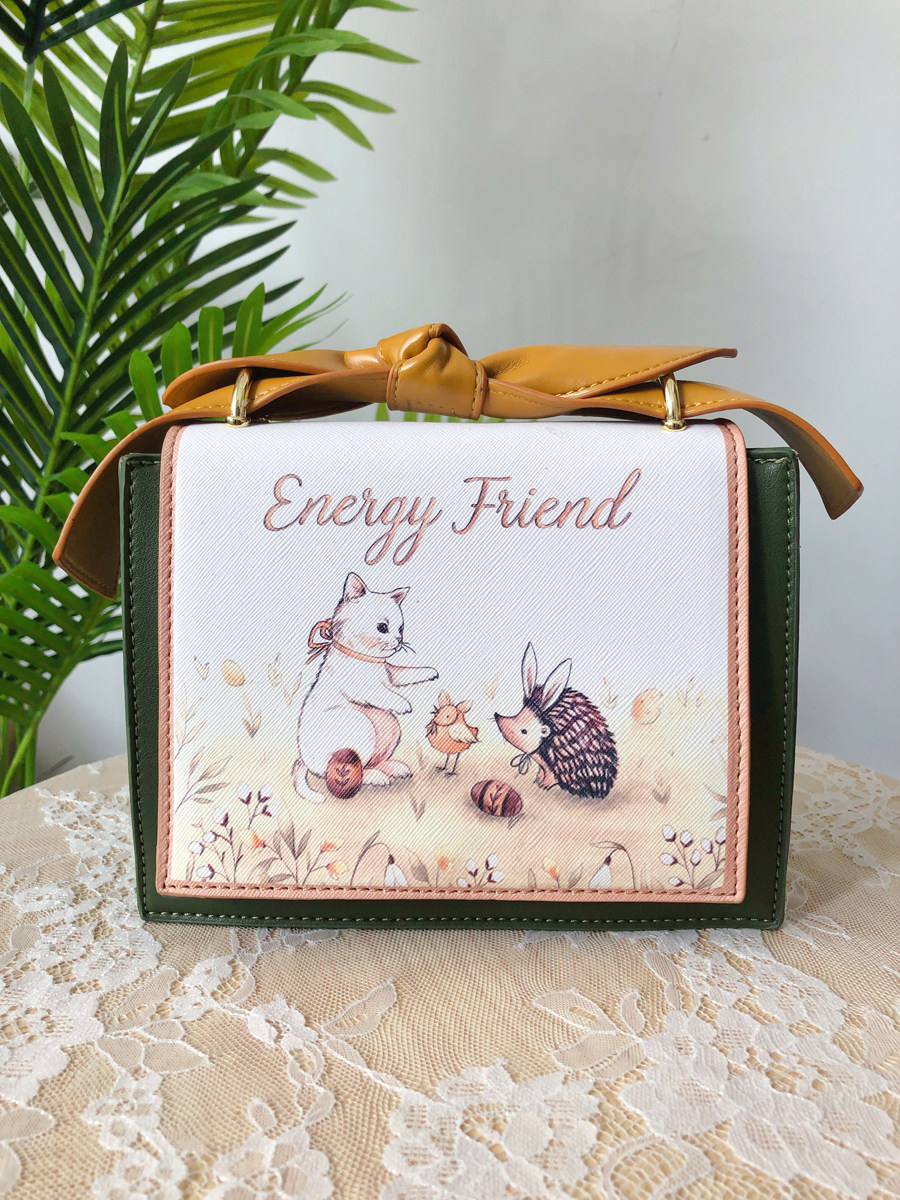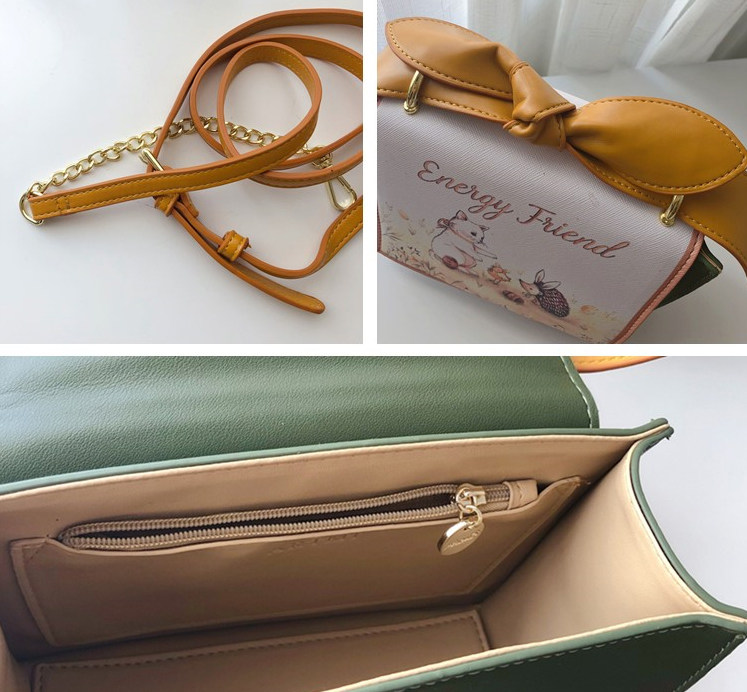 墨绿色和姜黄色的碰撞擦出青春年轻气息,时尚又吸睛,手柄处的大大蝴蝶结就像兔耳朵一样,和包包的小兔子动物印花相呼应,满溢甜美少女感的一款减龄包包!