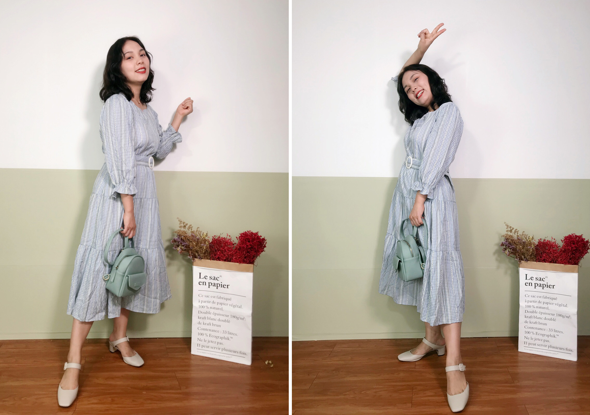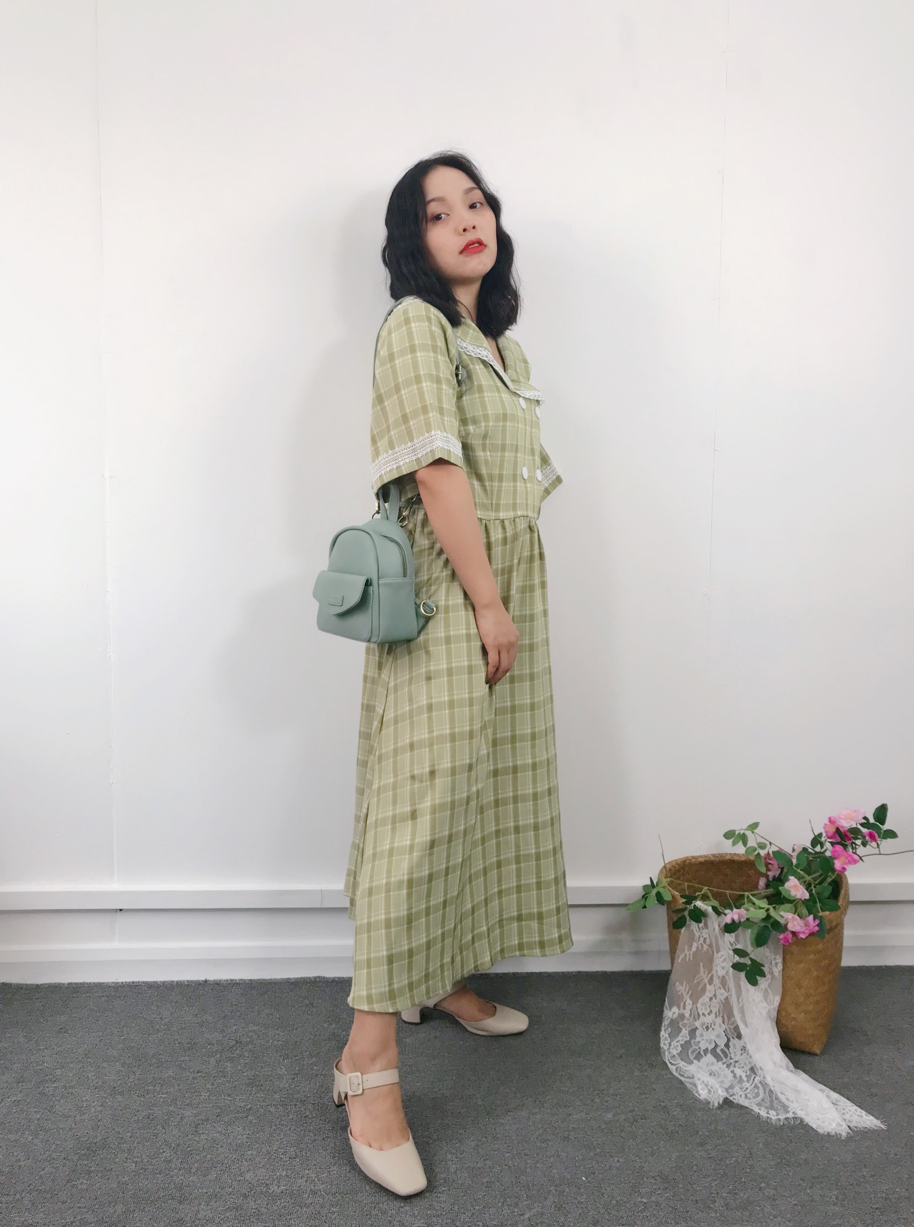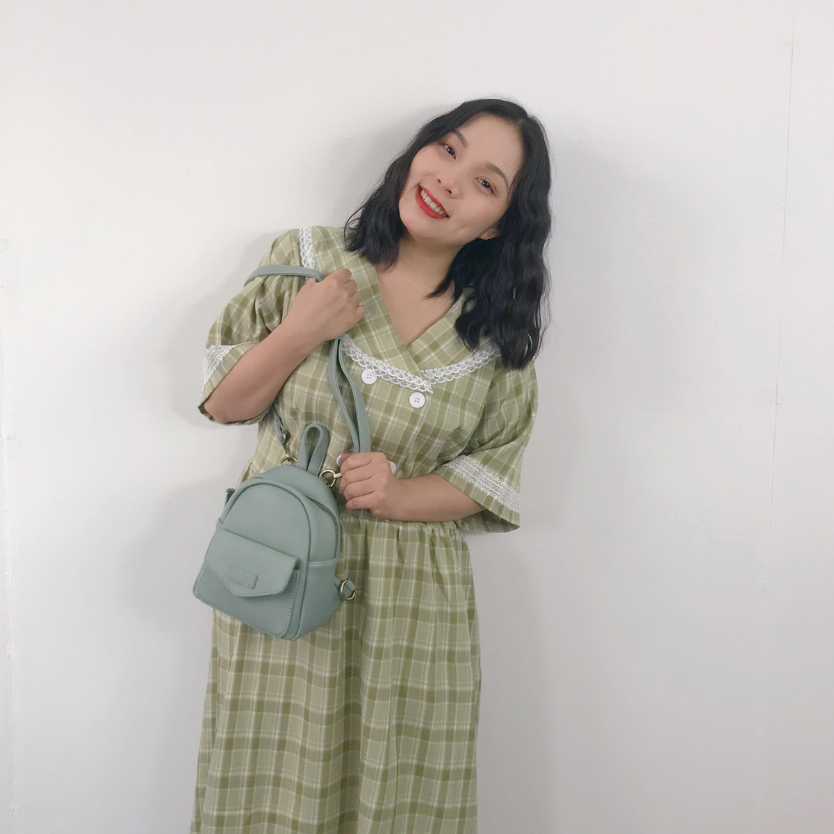日常的穿搭也是完全不用担心,包包是带着清爽气息的豆沙绿,适合一年四季都适合使用的颜色哦,这样的炎夏季节,sisi小姐姐选择这款草绿色的格纹连衣裙配上这个双肩包,选择的是单肩携带,复古又带点可爱的小姐姐形象很受男生们的青睐呢!