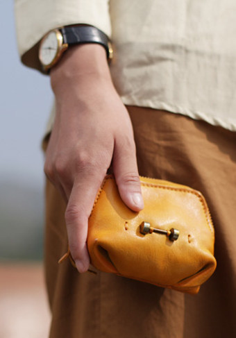 不对称的圆润迷你钱包,牛皮材质提升复古时尚感