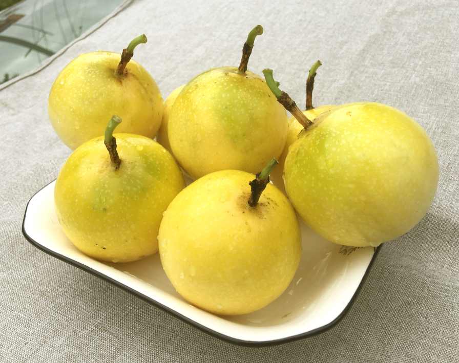 不同于普通的紫色百香果,因有着金灿灿的外表故曰其名,黄金百香果,是极特别的存在。黄金果比紫果个头略大一点,果皮却比紫果还要薄,果汁更丰富,甜度可是紫色百香果的5倍哟。