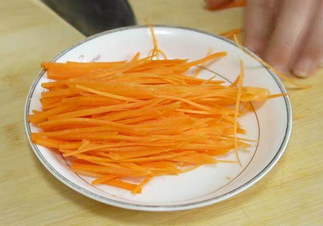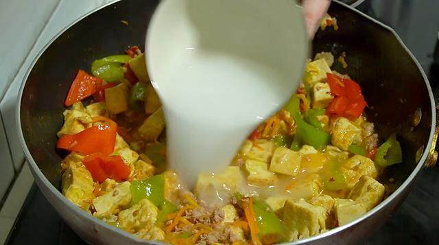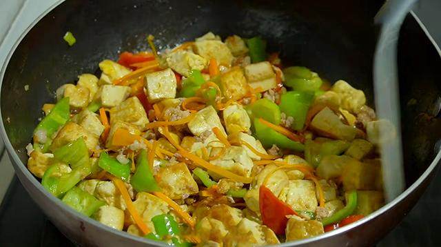 13、先把胡萝卜丝炒到变软,放入煎好的豆腐块,倒入调好的料汁,开大火炖3分钟。