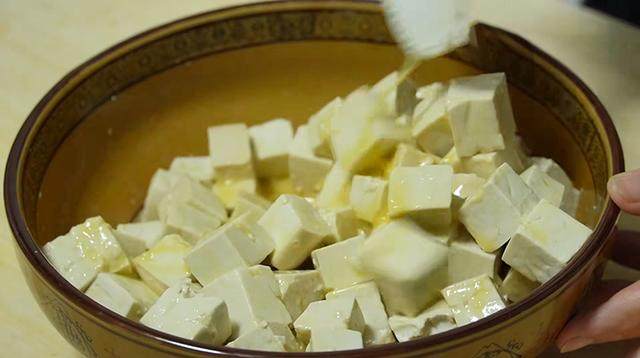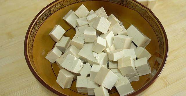 1、准备一块老豆腐,先切成厚片,再改刀切成小方块,装入大碗里备用。