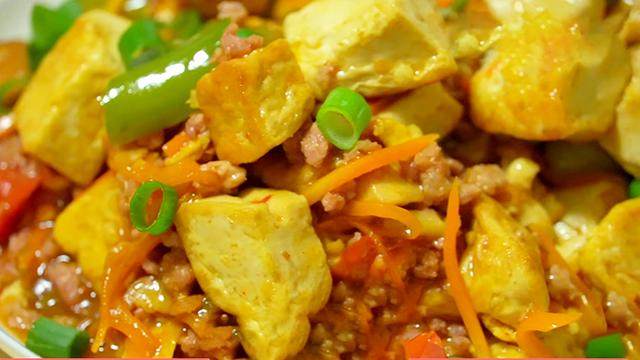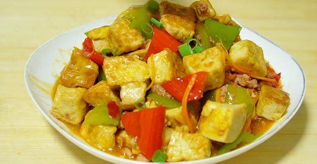 老豆腐特别适合焖炖,久煮不易烂,和肉类搭配在一起,再加入少许的辣椒,切成块的老豆腐,吸收了肉汁的肉味,一筷子下去,香辣下饭,还不用担心发胖。