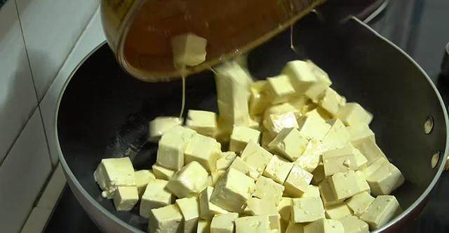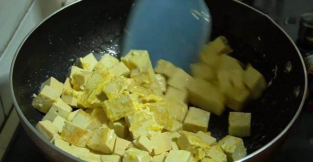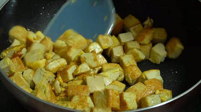 10、等豆腐块都变成金黄色,先成盛出来备用。