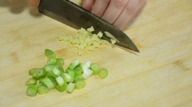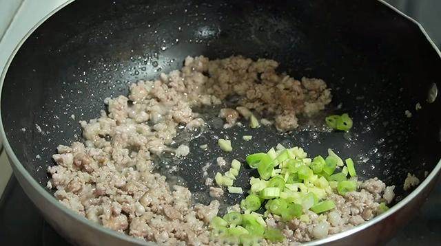 11、锅里再少加点油,放入肉末翻炒,把肉末炒至完全变色后,放入葱花和姜末,炒出香味。