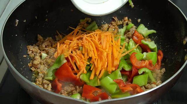 12、加入一勺豆瓣酱,先把红油炒出来,再把青红椒和胡萝卜丝加进去。