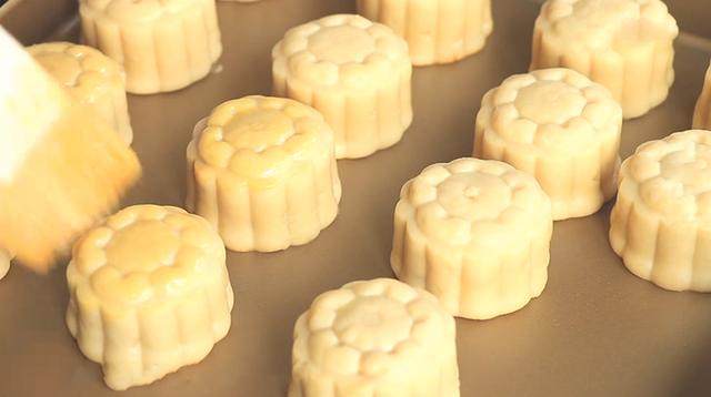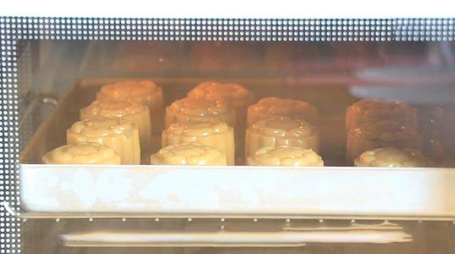 14、月饼定型后,顶部刷上一层蛋黄水。再放入烤箱烤15分钟。