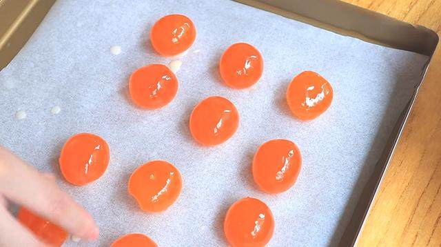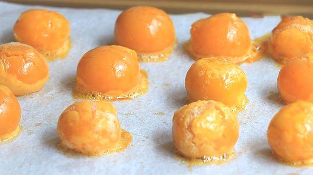 3、准备几个提前腌制好的新鲜咸鸭蛋,取出咸蛋黄。新鲜的咸蛋黄,是硬质的,我们用清水将咸蛋黄清洗干净,摆在油纸上面。