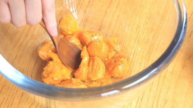 5、下面我们把烤熟的蛋黄,放入碗中,用勺子给它碾碎。