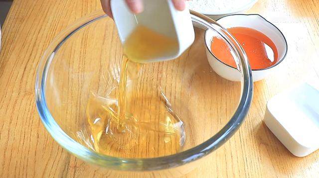1、首先我们准备饼皮的部分,花生油50克、转化糖浆140克、枧水4克,全部混合在一起,搅打均匀,一定要搅拌混合。
