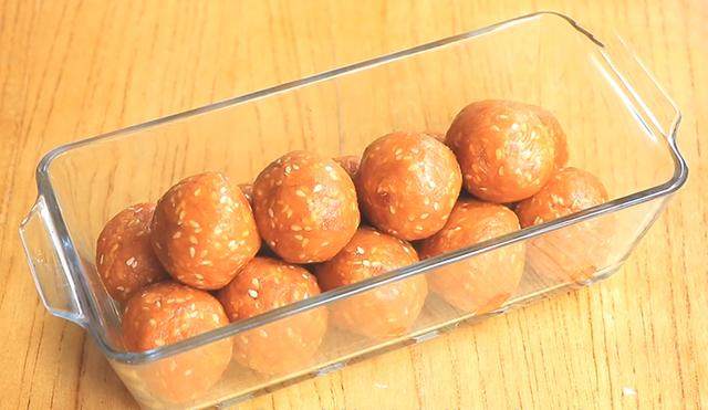 7、我这里用的是50克的模具,馅料部分分成30克每个,团成团,封上保鲜膜,放入冰箱冷冻30分钟左右定型。