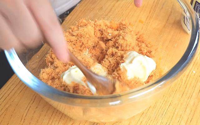 6、加入炒好的白芝麻、肉松、沙拉酱,用勺子搅拌混合均匀,用料的比例没有特定,大家可以根据手感来定,能捏成团就可以了。