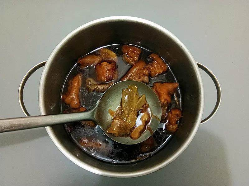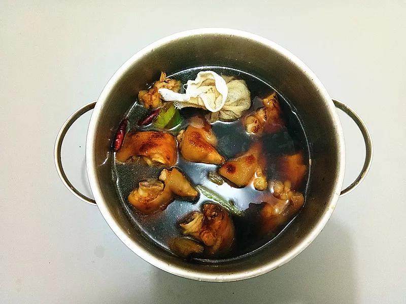 做法11、待猪蹄软烂后,加入食盐,拣去葱姜等调料,转大火收汁。