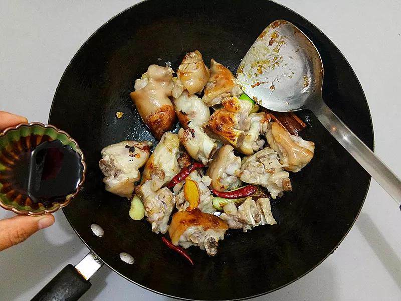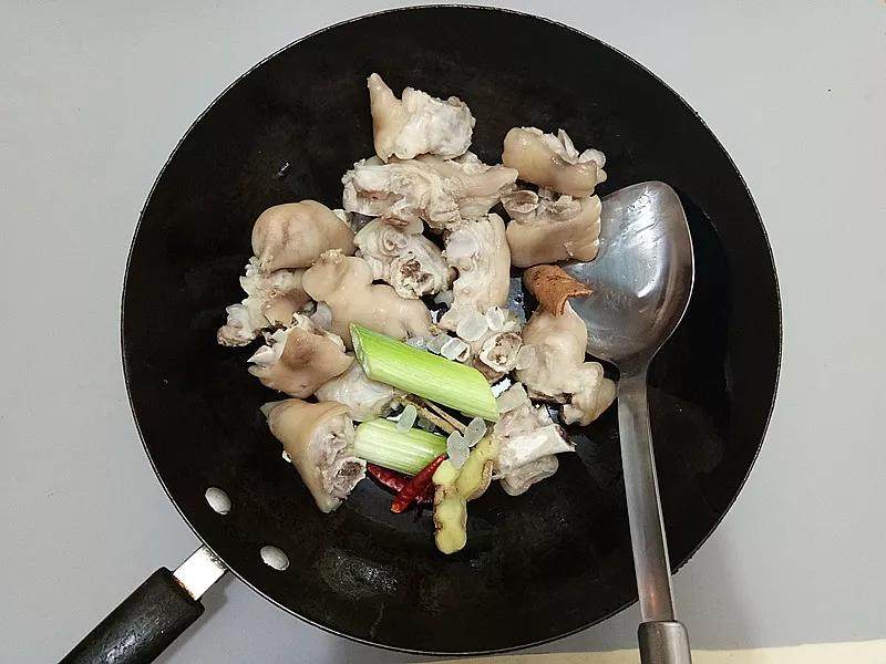 做法5、热锅谅油,放入淋干水份的猪蹄,葱姜、干辣椒、冰糖等调料。
