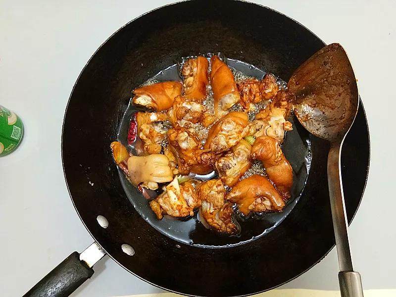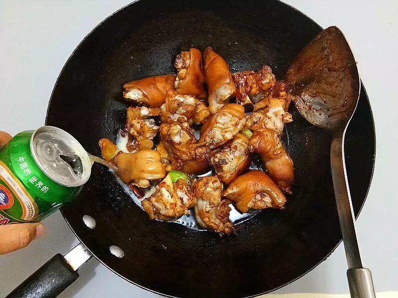 做法7、加入老抽小火炒至猪蹄上色,加入啤酒没过猪蹄。(啤酒不够加些热水