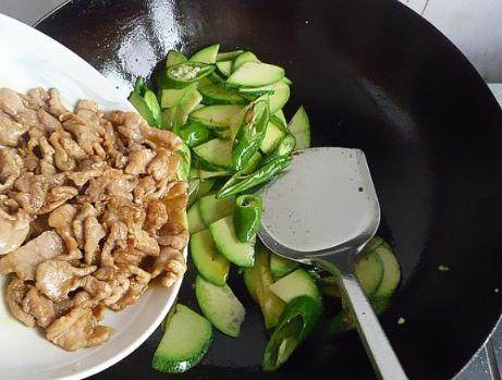第五步,待倭瓜稍微变软之后,放入尖椒,大火快速的翻炒均匀,加上盐调味,再放入炒过的猪肉;
