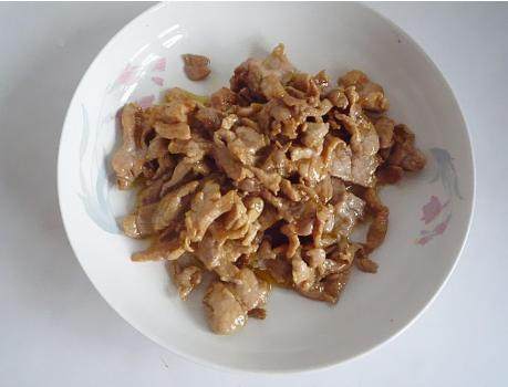 第三步,炒锅中添上油,放入腌制好的猪肉片,快速滑炒均匀,待猪肉被炒至变色后,即可盛出;