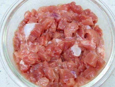 第二步,猪肉清洗干净后,沥干水分,切成片,放在容器中,加上盐、胡椒粉、料酒、酱油和淀粉,拌匀后,腌制一会;