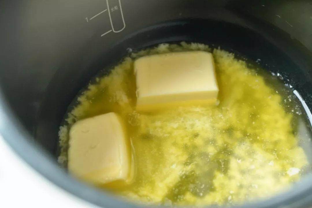 4、电饭煲按下煮饭键,然后放入40g黄油待黄油融化。