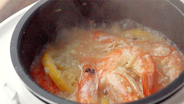 6、放入虾和柠檬片搅拌均匀,再倒入柠檬汁,加盖焖20分钟。