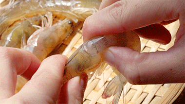 2、20只基围虾轻折头部和身体的连接处,挤出虾脑后拉出虾线。