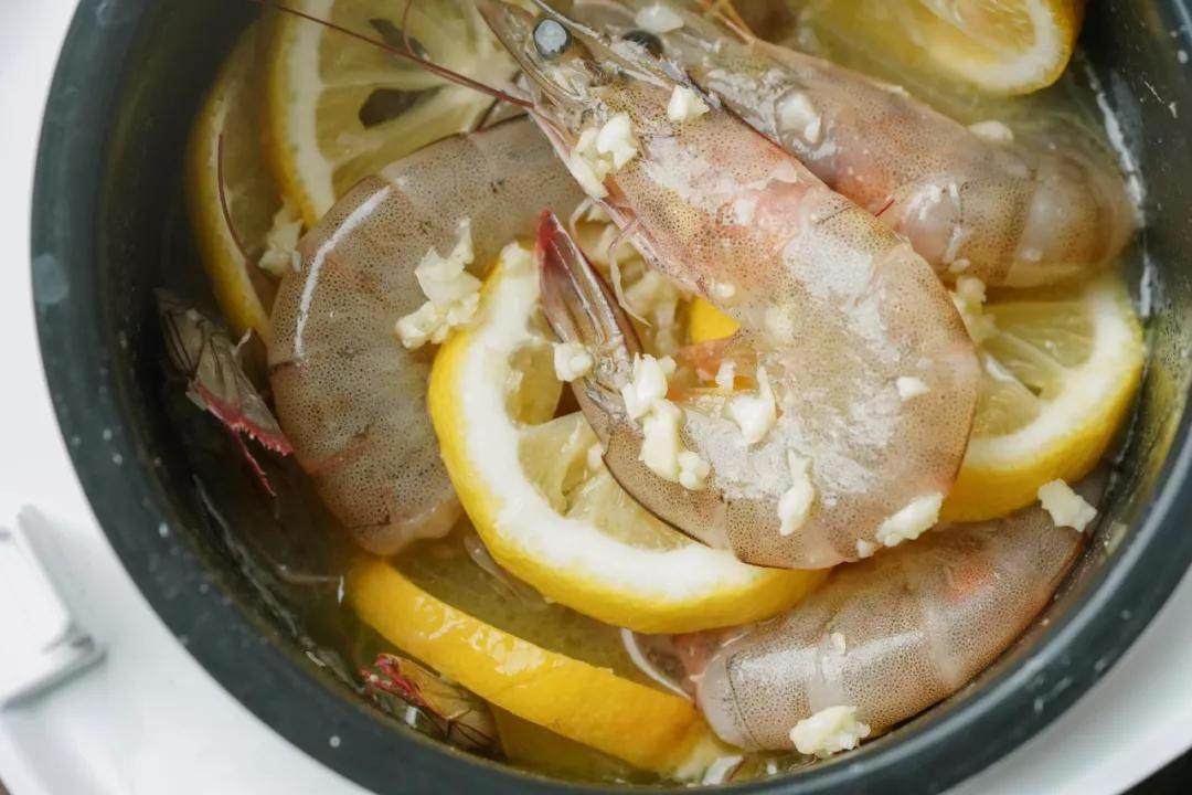 3、处理好的基围虾洗净,加入2勺料酒、2勺柠檬汁、半勺盐和半勺白胡椒粉,腌制15分钟。