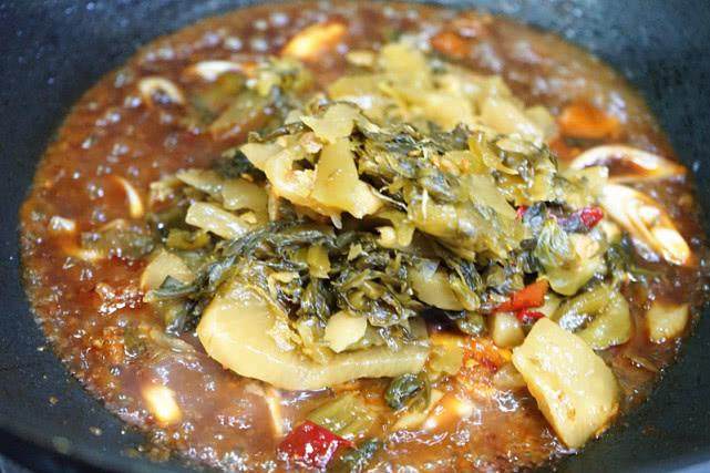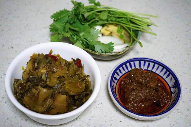 7、关火后放入洗好的香菜,这种酸甜包里还有腌制好的酸萝卜,酸酸脆脆,很是下饭呢。