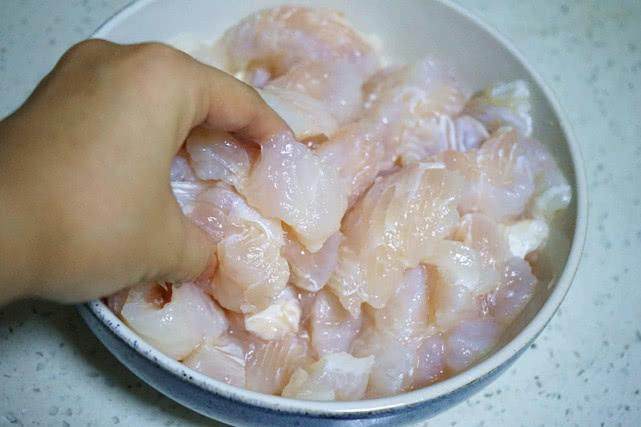 腌料我是放了一半,感觉酸菜鱼的腌料、调味料都放入怕会过咸,腌料和鱼一起慢慢抓匀,如果比较干,就放入一勺料酒。