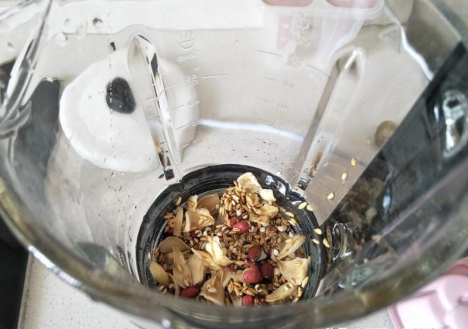 2、注意莲子要去心,否则会发苦。然后把准备好的所有食材,都放到破壁机中。