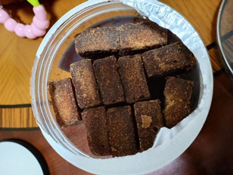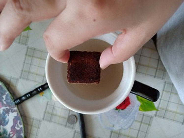 打开所有的包装之后,就可以见到里面红糖块的真面目啦。首先扑鼻而来的是浓郁的蔗香甜味,但是很自然不是香精的味道。它是小方块的样子,一块冲泡一杯红糖水,不多不少正合适。