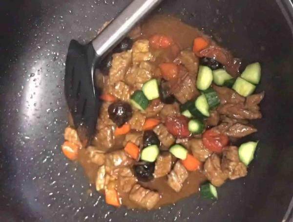 7.待汤汁浓稠放入黄瓜粒,翻炒均匀即可关火。