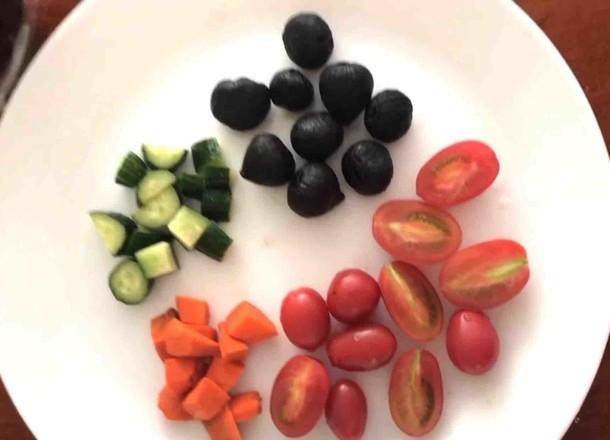 2.各种配菜处理好:黄瓜胡萝卜切丁、小番茄一部分切两半,一部分不切,黑蒜无需处理。