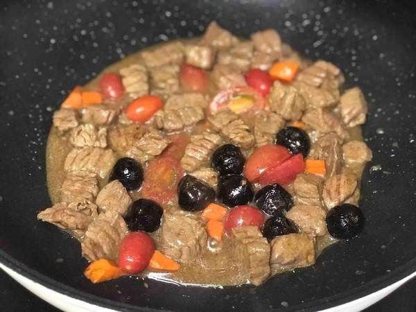 5.加入胡萝卜粒和黑蒜煮至牛肉汤汁出来。