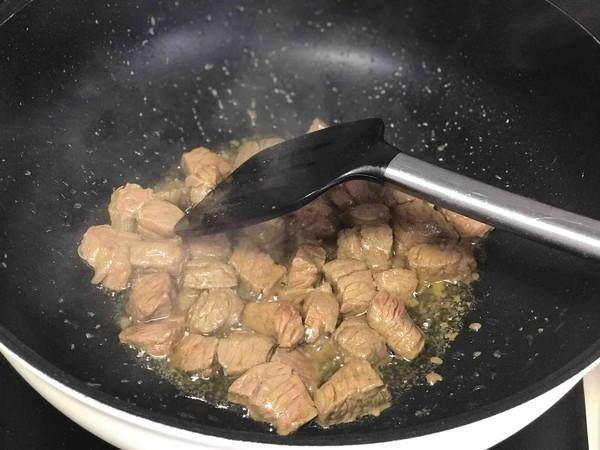 4.油烧热后放入牛肉粒翻炒至断生。